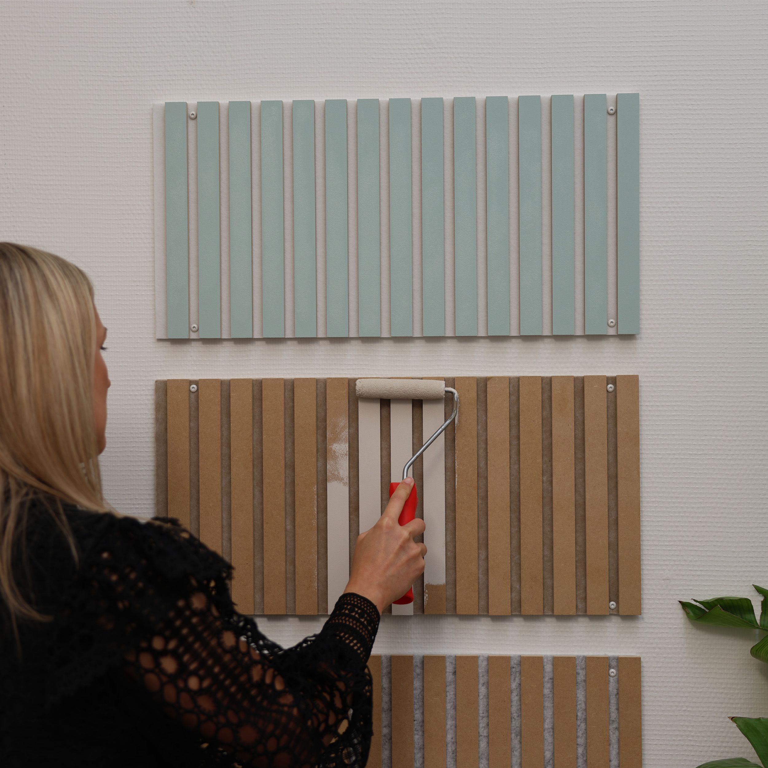 These acoustic panels consist of MDF slats mounted on an acoustic PET felt material made from recycled