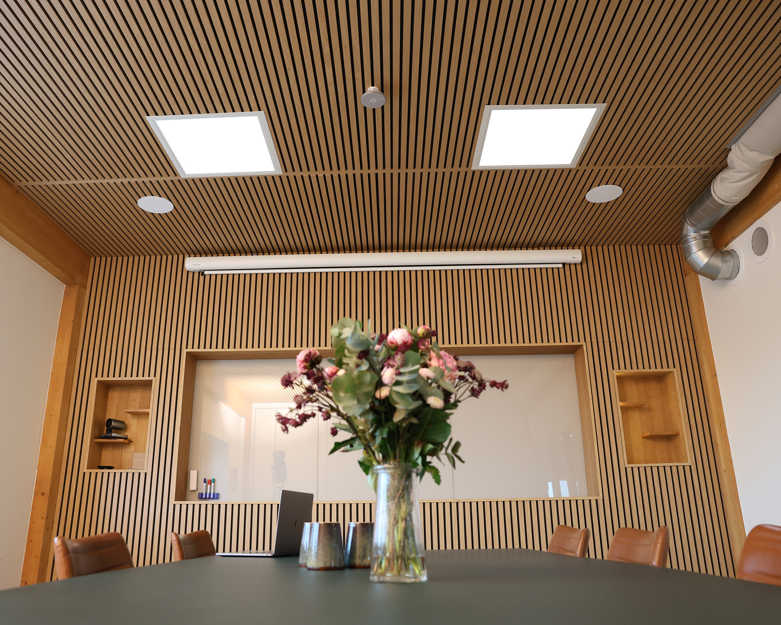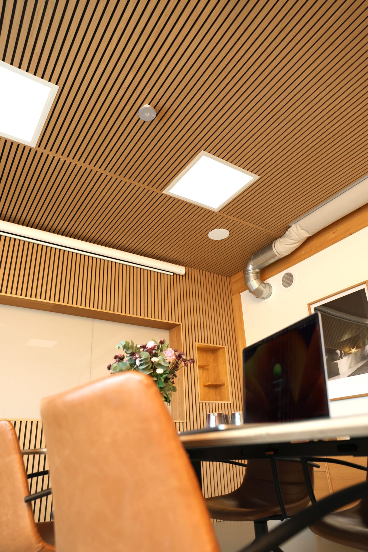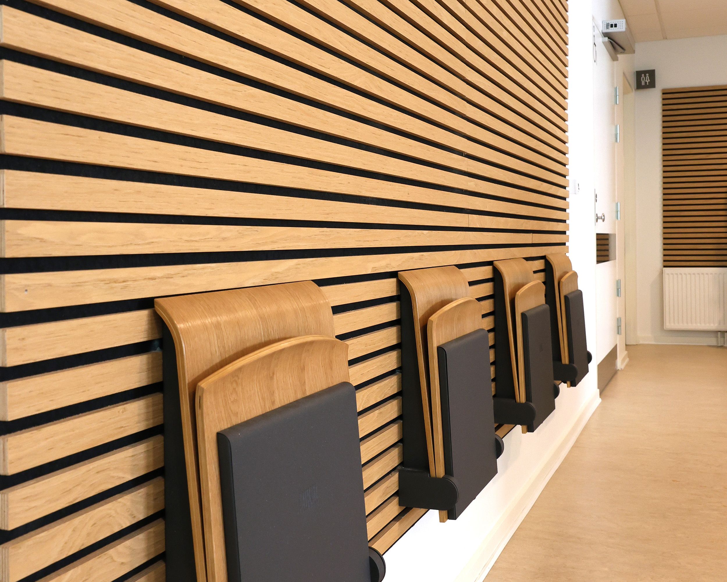 Like all BY VENØ panels, our fire-retardant series features acoustic felt made from recycled plastic combined with real wood slats — reducing reverberation and enhancing indoor comfort.